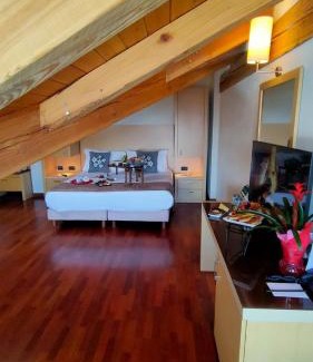 Located along a mountain road 40 minutes from the city of Bardonecchia, isolated between the majestic mountains and a lush forest, at an altitude of 6539 feet, the Resort has a wellness center with indoor pool and spa. The Hotel is located right on the ski slopes with ski school and rental on site. The hotel has 1 buffet restaurant where it is possible to purchase half board packages. Free parking, located 1640 feet from the hotel beyond the woods. We have limited space in our garage, with only 10 parking spaces available, accessible only by reservation and for a fee. The Savoia's large rooms feature an LCD satellite TV and elegant parquet floors. Some also enjoy views of the valley and mountains, while others overlook the forest. Pets are allowed at a cost of EUR 35 per stay, per room.