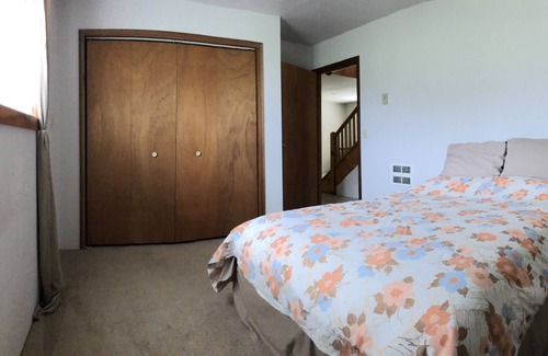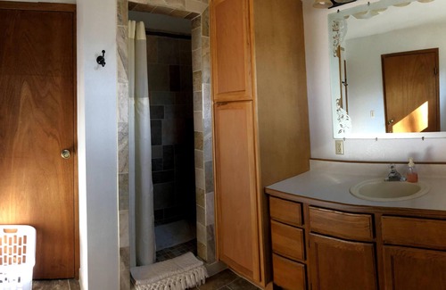 On the main floor there is the master bedroom with a king bed and on suite with a walk in shower along with a small bedroom with a twin bed and the laundry room, which is also a full bath with shower/tub combo.