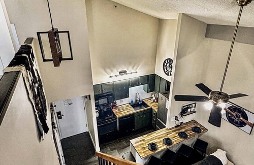 This elegant and sophisticated 2-bedroom/2-bathroom slope side loft, which sleeps ten people, is bright and open with luxury ceramic tile, a modern kitchen with exquisite butcher block countertops, and a kitchen fully stocked with everything you'll need to prepare, cook, and serve a delicious meal. The kitchen opens up to the living room area allowing for relaxing evenings in front of the TV with an electric fireplace, and access to the balcony where you can sit back, have a glass of wine, and enjoy the cool mountain breezes!