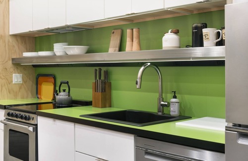 Full Kitchen: refrigerator, freezer, oven, dishwasher, utensils, coffeemaker, dishes, and cookware.