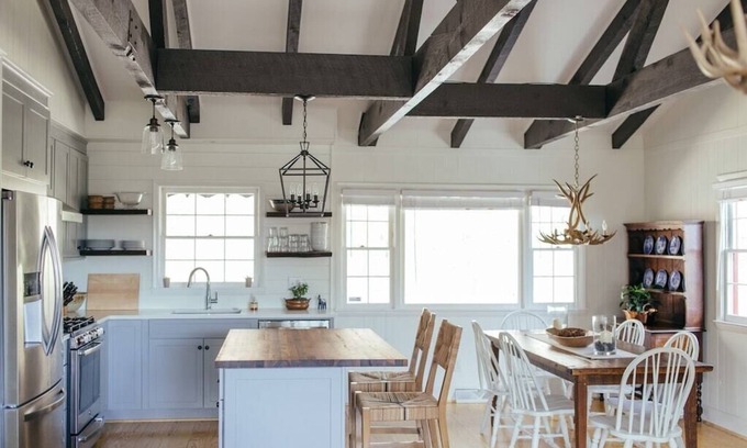 • Chef’s kitchen provides all you need to create a delicious meal, with top-of-the-line goods as well as staples including olive oil, spices and baking essentials. Gather around the reclaimed heart of pine dining table or dine outdoors on the spacious deck.