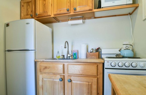 Scarlet is a separate studio cottage and sleeps 2 in the queen bed. This cottage is spacious and features a fully equipped kitchen with your choice of indoor or outdoor dining.