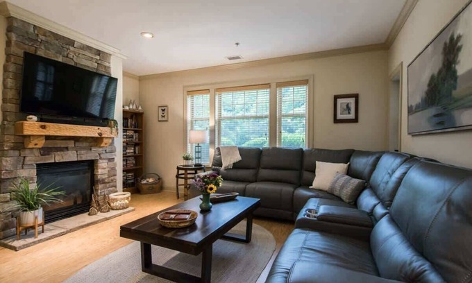 At this peaceful 2BDR condo guests can enjoy views of the golf course while relaxing on our screened-in porch, play board games by the fire, or unwind after hitting the slopes at Cataloochee. Free daily attraction tickets are included with your stay—downtown, hiking trails, and the Wheels Through Time Museum are all a 10–15 minute drive. A comfortable, well-stocked home base for an adventure in the Smokies!