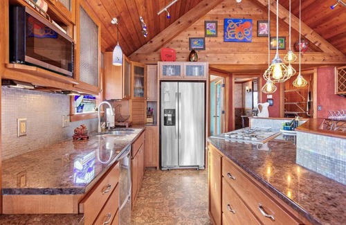 This property has a restaurant sized Ice machine located outside. There is a bbq with a pizza oven that sits on the bbq. There is an outdoor dining area with heaters on timers on the deck for the cool evenings. We also supply a large refrigeration system on the deck for all of the beverages you can fit