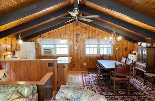 Charming chalet located at the base of Cathedral Ledge. Close to Echo Lake and the national forest for hiking and lots of outdoor fun! Perfect for year-round activities such as skiing, hiking, ice climbing, outlet shopping and much more! This cozy 3 bedroom chalet includes a dishwasher and granite counters. The warmth of knotty pine, rustic beams, large deck and a toasty fireplace will keep you perfectly cozy. Large sliders give great views of fall foliage or snow-capped trees. WiFi and a flat screen TV (with Roku) will keep all ages entertained. Minutes to downtown shops and restaurants while feeling secluded in your Bavarian cabin getaway. Great for families or couples. NH MR Lic. No. 102261