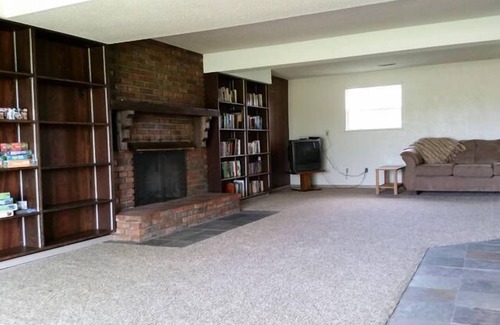 Bedroom #1 has two twin beds, bedroom #2 has a full sized bed, bedroom #3 has a queen sized bed, and bedroom #4 has a queen bed and an attached bathroom. The other 3 bedrooms have a shared bathroom, in addition to an extra bathroom in the basement. There is a stocked kitchen, dining room table, family room with a comfy couch, and a roomy basement with 2 couches and plenty of board games.