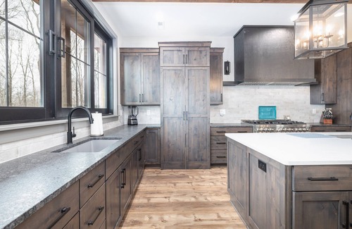 When it's time to unwind, retreat to the cozy living area and gather around the fireplace for stories and laughter. Next door is the open concept fully equipped modern kitchen which includes an island with extra seating and a rustic dining table. For a cinematic experience like no other, head upstairs to the theatre room and enjoy your favorite films in style, accompanied with an arcade machine loaded with games that will reunite you with your youthful memories.