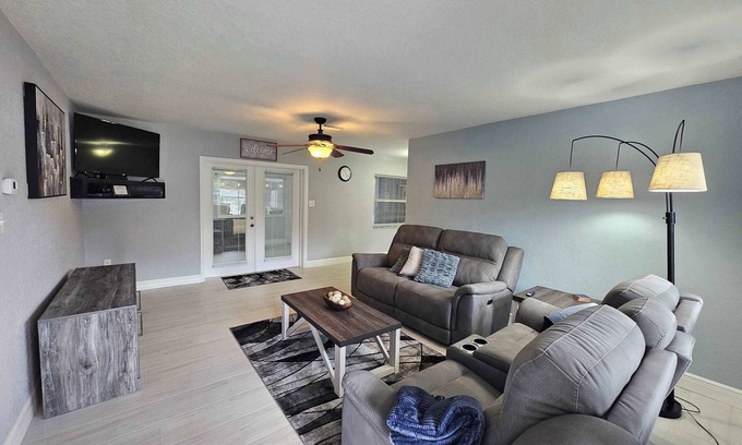 Leave your worries behind once you step into this Beautiful Pool home on the water with a private dock. Home features 2 large bedrooms with plenty of closet space. The first bath is a Tub/Shower combo, the other has a stand alone shower and is located just off the pool deck, perfect way to keep the water out of the house. The large Den is wrapped in windows with 2 futon couches to accommodate more guests and overlooks the spacious patio Bar. With plenty of seating around the bar, patio and pool area this outside dream is the perfect getaway! Nestled along the water you can sit on the private dock featuring a boat lift if you want to bring your boat and spend sometime out on the water.