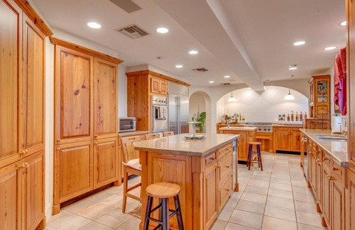This breathtaking waterfront home is surrounded by lush tropical landscaping. It offers privacy, gorgeous water views and amazing sunsets! The 4,000 square foot home is multi-level with 2 master suites, 2 guest bedrooms and 3 and a half baths. Floors are red oak and imported Italian tile with carpeted bedrooms. The great room features high ceilings, a beautiful wood bar, pool table and plenty of seating. The kitchen features custom design European cabinets crafted from 120 year old pine. There is a butcher block work station with sink. There is also an additional island plus seating with granite countertops for a cozier breakfast or lunch. This gourmet kitchen has built in stainless steel appliances, offering a Thermador 6-burner professional gas stove and range hood, Sub-Zero refrigerator/freezer, microwave and double ovens, and a Asko dishwasher. The laundry room is off the kitchen and features large load capacity washer and dryer.