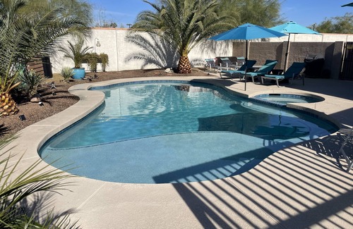 5 Star-Resort style backyard! *Heated Pool & Spa, Arcade/Game room, Putting green & Cinema Loft. A short trip to Old Town Scottsdale & Tempeβs ASU. The stylish well-appointed property is conveniently located by the 101 in a safe quiet community in Scottsdale. A full-time vacation rental, ideal for families with kids-newborns, business travelers, solo adventurers & couples. 5G Wi-Fi6 router for zoom meetings. *POOL HEAT-SEE DETAILS*