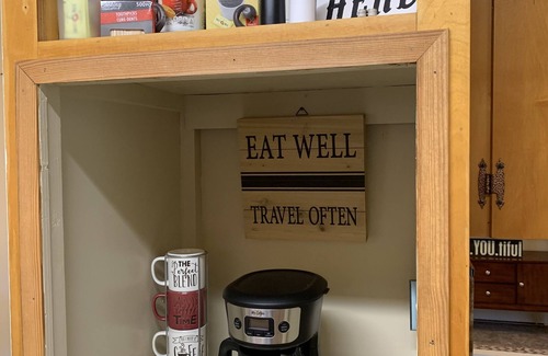 KITCHEN: fridge, microwave, drip coffee, ground coffee/tea, silverware, wine glasses, mugs, cups and plates (Qty 8 each), children's dinnerware, knives, pots/pans, skillets, baking dishes/sheets, mixing bowls, dish sponge/towel, oven mitt, salt, pepper, dishwasher, dish detergent, paper towels --- (starter quantities are provided only. It is the guests' responsibility to provide these items once they have run out)