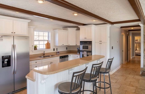 • Our stylishly furnished cozy cabin features an open floor plan, with a gas log fireplace in both the living room and the master bedroom, creating a homey atmosphere throughout.
