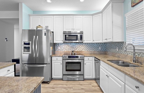 The sunny living room features two separate seating areas. One includes a plush sandy-colored sleeper sofa, a matching loveseat, and a striped armchair. The ensemble centers around a large coffee table and faces a flatscreen TV. The other seating area has a white loveseat that faces two white wicker chairs, making for the perfect place to chat and hang out with your fellow vacationers. A dedicated writing desk nearby provides a great spot for remote work. In the casual dining room, you’ll find a hardwood table surrounded by six chairs. The adjacent kitchen has an angled island bar that offers additional stool seating. The kitchen also features white cabinetry, sleek counters, and stainless-steel appliances. From this main great room, you can access a screened-in porch furnished with a picnic table and chairs, great for alfresco-style dining and enjoying the Florida weather.
