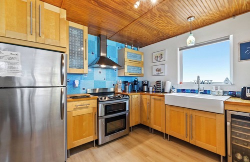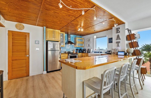 As you walk into this fantastic Golden Arms condo you are greeted by the tastefully decorated décor and views of the ocean that will delight! Sit back, and relax after a fun-filled day on the beach as you take in the views from the living room featuring a sofa sleeper, 75" smart TV, and sliders to the oversized balcony overlooking the pool and ocean. The fully equipped kitchen features stainless steel appliances and is perfectly stocked for those that enjoy preparing meals for the family! Cooking essentials include a crock pot, toaster, serving platters, Keurig, drip coffee maker, kettle, and more! Please note - wine fridge is not available for guest use. Meals with family can be enjoyed with views of the ocean in the dining area with seating for 6 with additional seating for 4 at the kitchen counter.