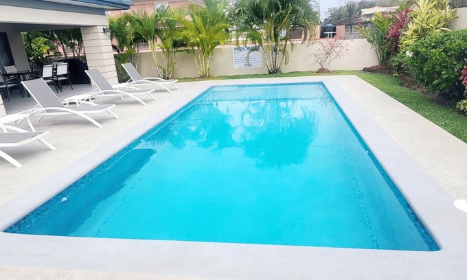 With its 4 bedrooms each with its own ensuite bathrooms. The villa is ideally suited for 4 couples or 2 families with children. There are two master bedrooms with King beds, and the other 2 bedrooms have 2 Queen beds each. In addition to the 4 ensuite bathrooms, there is a 5th full bathroom accessible from the porch, for the convenience of people who need to rinse off after coming from the beach, or pool users who need to go to the bathroom. Each bath shower area is fully walk-in, with laminated glass panels for safety and rain shower heads for luxurious bathing. The open showers also mean that mobility challenged guests are accommodated, as there is no ledge for them to have to step over.