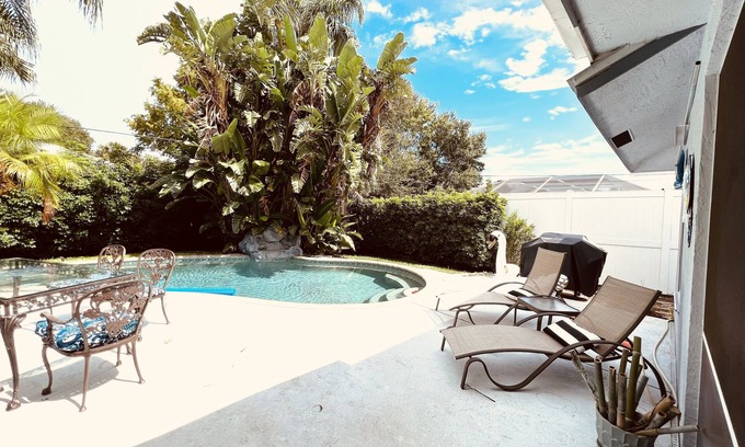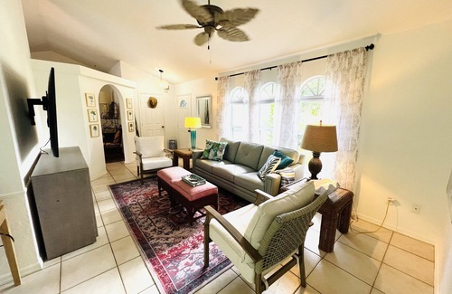 Escape to the enchanting Sea Grape home. The home sits in a tropical paradise garden. There is a fully fenced backyard that is dog friendly and private. The quiet neighborhood provides a perfect blend of serenity, elegance and convenience. It’s an idyllic place for those seeking a memorable Florida getaway.