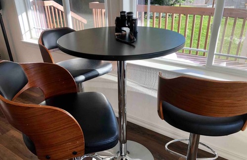When you stay at Sea La’VIEWS, you’ll imagine every “object” here is Art, and every piece must have an alluring story. From the massive 10 foot trophy sailfish on the wall, to the Impressive 12 foot shelves, bench tables, and mounted guitar racks that were all created, and handcrafted from Live-Edge Red Cedar. Most of what you see here are one-of-a-kind pieces. The dining table holds a seven Foot Slab of Artisan beveled glass that sits on Chrome & black iron.
