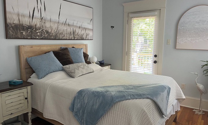 This sea-themed suite features a bedroom with comfortable queen-sized bed, a private bathroom with spacious shower, and access to a large shared deck overlooking the treed backyard. In the morning, enjoy a delicious home-cooked breakfast in the Garden Room, which features lots of greenery and an indoor water fountain. We are walking distance to a wide array of amenties, including plenty of food & drink options, arts & entertainment, and the City Walk hike-and-bike trail.