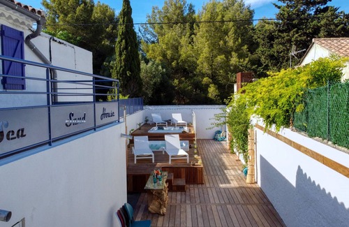 Nestled in the heart of the beautiful Arène Cros bay, 10m from the sea, the villa «Sea Sand House» is fully in line with the trend of the housing galleries. The owners, self-taught, rely on an evolutionary and changing decoration to seduce you.Comfort is not lacking: 2 Jacuzzis, air conditioning, pétanque, paddle, exotic wooden terrace, air-conditioned glass roof, parking, etc.It is an atypical place, without concession, that will offer you a memorable and unique experience of The CiotatThe ambition of the owners? Offer a unique and accessible art experience to travelers looking for "beautiful places and beautiful things". Some of the furniture and objects are also for sale. On 150 sqm², this place of creation, made available to artists in low season for creative sessions, offers a subtle balance between design, architecture, and conviviality. All at the service of a key word: pleasure. Starting with the pleasure of the eyes. Facing south, you enjoy an exceptional view of the bay of Arène Cros which is at the foot of the house. Its crystal-clear water gives a glimpse of the bottom. It is a painting in perpetual renewal and of course a paradise to swim and explore the seabed. Ideal for 8 people, this house 3 times century old, was made with stones and sand coming from the bay, part of the walls moreover been peeled in the living rooms to make the visible. Each piece has its own universe. Nothing is left to chance, not even the entrance and the corridor which gather as many creations as another room.The extensive lounge/dining area offers a generous volume with the exposed frame which has been totally restored and offers 3 living spaces. A bar and a living room open, warm and where you can have an aperitif in the sofas graffitied by the artist Alin. The dining area is more cosy to receive comfortably.Master rooms of the house, the air-conditioned veranda and the main terrace offer an extraordinary view of the Mediterranean Sea. It is the ideal place to have breakfast to the rhythm of the elements. Every season, at every moment of the day the view evolves, and it is difficult to get tired of it. The furniture used here is design and contemporary. The kitchen is a place of conviviality where you will find all the necessary equipment to concoct gourmet dishes for your loved ones. Decorative masterpiece of this piece, a 2 m fist made by the plastic artist Patrice Goux.The night space invites you into the world of La Ciotat. All rooms are air-conditioned, benefit from new and quality bedding, wardrobes. The first bedroom is like an introduction to La Ciotat. It illustrates the glorious past of the Société “Provençale de Constructions Navales” which manufactured luxurious liners in the early 1920s. It is equipped with a double bed, a large travel trunk as a wardrobe, a shower, and many decorative elements of this universe. The second bedroom reminds us of the unique link between La Ciotat and cinema. You will find a decoration based on one of the first films of the Lumière brothers. "The arrival of a train at La Ciotat station" from 1896. It is equipped with a double bed and a wardrobe. The third chamber is dedicated to the world of aviation. Aircraft nose, engine piece transformed into a mirror, aircraft fins used as a tablet, airstrip light and highlight of the show a piece of furniture from a BOEING of the 70s that will allow you to store your luggage. These two bedrooms benefit from a separate, spacious, modern bathroom with a magnificent walk-in shower. The fourth bedroom immerses you in the underwater world. Submarine nose transformed into lamp, steel structures illustrating coral or octopus tentacle, unique bathroom furniture with organic shapes ,... You will find a double bed, a bathroom, a wardrobe. The balcony overlooks the jacuzzi area.This space is a particularly friendly space. 2 jacuzzis of 4 places are at your disposal and in operation all year, you will also find a bar made in teak root, a pizza oven, a barbecue, an outdoor shower and a small hut in which you will find a fridge, a washbasin and of course a large table for convivial meals. The private Petanque court is 10 m away. Everything has been thought out in every detail so that you let yourself be carried away by the sweetness of the place, that you rejuvenate yourself in this idyllic setting where design, seaside, scents of pine trees and Provencal vegetation will leave you the delicate imprint of these peaceful moments past the villa "Sea Sand House".Included in the rental: WIFI, end-of-stay cleaning, bed linen, bath towels, several parking spaces and your first consumables (coffee, toilet paper, garbage bag, washing-up liquid, dishwasher and washing machine capsules).We can provide you with a high chair and a foldable cot free of charge. Long-term rental is possible. Contact me for a quote.travelers accessThe accommodation is located on the first level of an old house on the edge of the bay. The entrance is private and the house is totally dedicated to you. A secure parking, private offers 5 parking spaces with surveillance cameras.Interaction with travelersYou will have a unique contact available to welcome you, carry out check-in and check-out.This person will introduce you to the property as a whole, how it works and will be available during your stay if you have any questions about the accommodation.She will give you and comment on our tourist guide who advises you on typical days to discover the region.She will give you the book of decorative objects for sale.She will be reachable by email and on her mobile phone.Other remarksThe house has been decorated with care for you. Many decorative objects are lent directly by the artists. Some furniture has even been made, optimized on site. All this for your pleasure. We expect you to pay attention to this in return. Thank you in advance.Parties and events are not allowed and sound volume detectors are installed in the house to avoid wild parties. Pets are not
