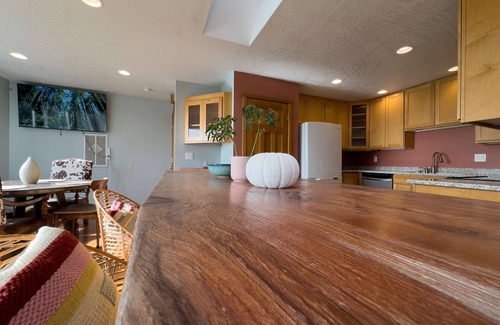 Inside: The first floor features a massive garage with central heat, and offers a ping-pong table and a foosball table, a refrigerator, and a 1/2 bathroom with a single-vanity sink. The garage has concrete floors and has finished drywall. The living space is on the second floor. You walk up a set of hardwood stairs with windows overlooking a cypress tree, and find yourself in the open living/kitchen/dining area. The kitchen features tile floors, a Corian countertops, real-wood cabinetry, stainless steel appliances, a complimentary Keurig machine with liquid creamer, a dishwasher, garbage disposal, fridge, electric glass stovetop, microwave, toaster, and full kitchen amenities. If you need it, ask, and we'll probably send it over :) The open area features a large skylight to let light in, and the wall facing the ocean is mostly glass, to maximize the ocean view and sunlight. The kitchen features bar seating, and the dining room offers a round table. We have a desk we can place by request in the living room if you want it for teleworking to enjoy the view. There is a full bathroom off the living room, featuring plenty of counterspace, a single vanity sink, Corian countertops, and a shower/bath combo with a removable shower head. The giant bedroom does not share any walls with the living room, it is off the hallway coming into the living room. In the giant bedroom you will find pitched ceilings, a ceiling fan, hardwood floors, two day beds (appx. full size) and a king sized bed, and a desk overlooking the front yard.