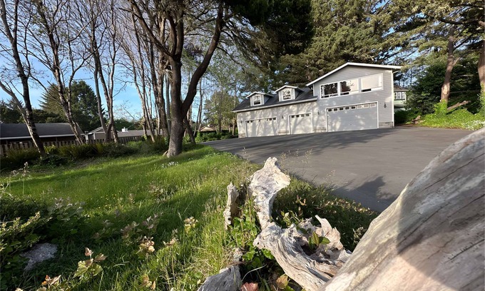 Outside: House features a shaded backyard enveloped by some Cypress trees. It offers a North-state vibe of moisture and tranquility. It has a manicured lawn and space for the kids to run and to walk the dog around. It is unfenced. The front yard features some pine trees and deciduous trees. In the partial shade we have a picnic table to enjoy your afternoon tea or evening cocktail. The home sits on "row 2.5" from the water, meaning it is about 2 1/2 homes back from the beach. We are a few hundred feet from the Pebble Beach trail to the beach access. You can hear the ocean both inside and outside the home. The home offers good privacy on a larger size .35 acre lot. There is no issue with parking, we can easily have 8+ vehicles at the property.