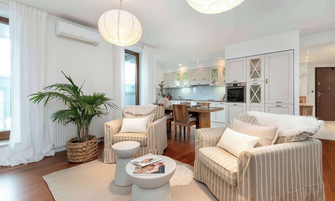 This modern 79 m² apartment is an excellent choice for families, groups of friends and business travellers. Guests have access to a spacious living room with a balcony, a fully equipped kitchenette, a bathroom with a bathtub, free Wi-Fi and a Smart TV. Additionally, we offer a parking space in the garage. Pets are welcome (for an additional fee), and we can issue a VAT invoice upon request.