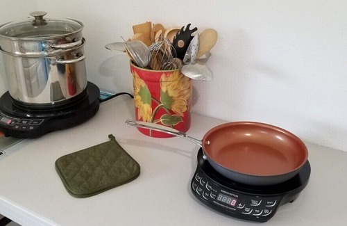 Kitchen has Pots, Pans, Sinks, 2 INDUCTION COOK TOPS, Microwave Oven, Toaster, Coffee Maker, Grinder and ORGANIC Coffee, Full Size Refrigerator, Plates, Glasses, Bowls and more; it is setup with all that you will need for cooking good quality meals. NO OVEN however.