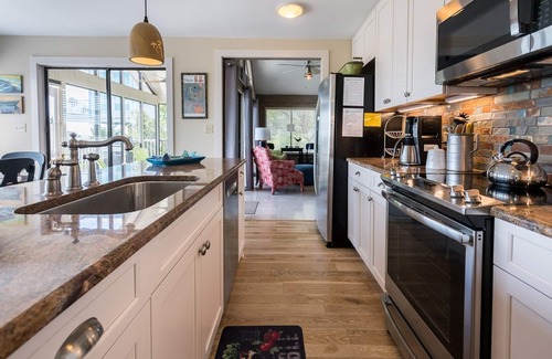 Fully equipped kitchen, coffee maker, electric range, refrigerator with ice maker, stand-alone ice maker, microwave, dishwasher, toaster, crock pot, blender, hand held mixer