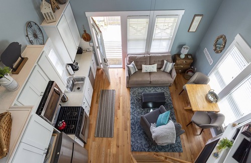 Appleseed boasts sky-high ceilings creating an open airy feel. The main room lives large with a full kitchen, dining table, cozy couch and fireplace. The kitchen comes well equipped with stainless steel appliances, including gas stove, and everything needed to create a simple charcuterie board or a full course meal. There's plenty of room to stretch out for games, reading by the fire or watching a movie.