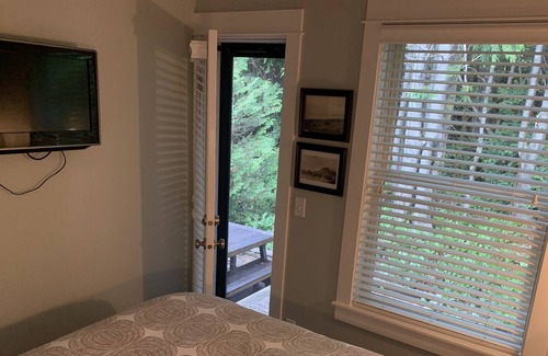 The main floor primary bedroom hosts a beautiful queen size bed, and is adjacent to the cabin’s tile floor bathroom. Theprimary bedroom exits through a private French door to a secluded patio where an outdoor living area awaits. Climb the main floor ladder to our cozy loft, where two twin size beds provide comfort for kiddos or another couple. The loft is a perfect retreat for kids, offering plenty of space to play games, and a window overlooking the cedar forest to the rear of the house.
