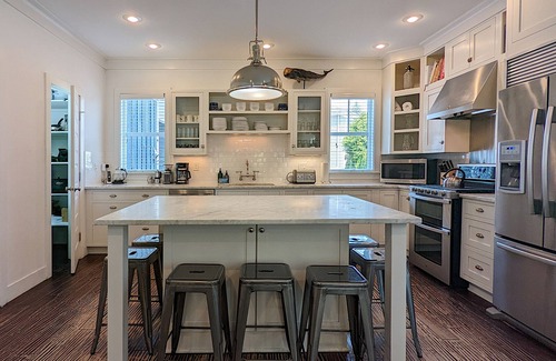 The large living room has a 70" flat screen TV with Apple TV, a DVD player, wood burning fireplace with raised hearth, large sectional couch, plus comfortable chairs and ottomans. A fully equipped gourmet kitchen, with stainless steel appliances, marble countertops and an expansive island with bar stools makes it a great place to entertain. The kitchen is well stocked with cooking utensils and items such as a waffle iron, juicer, hand-mixer, and blender.