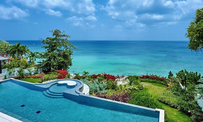 Seaclusion is an outstanding six bedroom beachfront villa set on one acre of tropical gardens on a bluff overlooking the beach and Caribbean Sea. This extraordinary home features unparalleled sea views from all living areas and 5 of the bedrooms. The elegantly furnished interiors also include a cocktail bar, living and reception areas, media room, formal dining room, entertaining kitchen, grand piano and fitness room. The main house has four bedroom suites each with a terrace or balcony. A stunning spiral staircase leads to the master suite on the upper level which includes a private terrace, walk in wardrobes and mesmerizing sea views. There is a further bedroom in a self contained apartment cottage for those traveling with staff or teenage children.