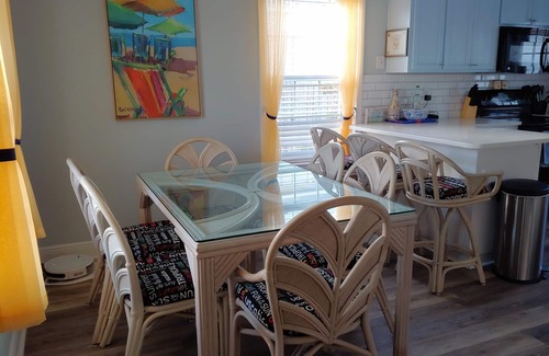 9 beach chairs/recliners in storage box, 2 carts, 3 umbrellas and a 2 person sea kayak with wheels /vests supplied along with air pump, boats OK; sleeps up to 9 (max 6 adults) - guest room upstairs has twin over queen bunk beds, master bedroom upstairs has a king bed, queen sleeper sofa in living room, and futon queen bed (new mattresses Nov 2021) in downstairs 3rd bedroom; updated kitchen and lots of extras plus 5 TVs - 1 block/3 minute walk to beach. All TV service is Internet streaming with free Netflix, YouTube TV, Prime Video, MLB, etc. There is a Ring doorbell at the front door so if you have any issues getting in you can contact us directly from there. Upgraded outside with wooden deck table & chairs plus bench and nicer chair cushions, changed bar countertops to quartz, upgraded barstools and added a full cabinet with drawers for sink (hot & cold water) - wonderful outdoor covered entertaining area with 43" smart TV - Weber gas grill plus a small charcoal grill so you can choose! Keurig K-cup coffee brewer along with drip coffee maker for ground coffee and a coffee grinder, Nespresso cappuccino-espresso machine; makeup mirrors in both bathrooms, smoke and CO2 detectors in all rooms. Outdoor chair cushions for new Adirondack chairs Mar 2024 in fire pit area now kept in storage boxes by swing plus storage area on left side of bungalow by bikes (for weather protection).