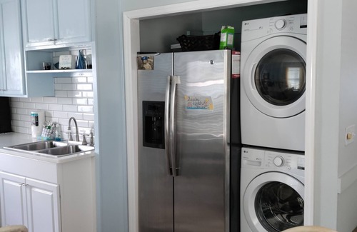 There is a small 1 bed/1 bath mother-in-law suite/bungalow at rear of property that is NOT part of the house rental, last 11 photos show this bungalow, but it may be available for rent at an additional cost if you need more space (rented offline). This has 3 rooms with total approx 325 sf - living area/full kitchen and 51" Smart TV, sofa is a full bed, bedroom with queen bed and 32" Smart TV, desk and printer, and bathroom/closet with shower, toilet, washer/dryer and vanity, plus covered rear deck and outdoor shower with hot/cold water and a small fenced yard for dogs, charcoal grill as well, plus 3 beach chairs and cart. Ask us via VRBO for rates and fees that are charged separately offline. There may be owners-friends staying in this unit separate from your rental of house but never other renters - they do NOT share any part of house amenities but do have to walk on north side of house thru gate to get to the bungalow. Mini split AC-heat unit installed 2021. This has a ground coffee brewer and a Keurig K-cup machine plus milk frother for cappuccino. If you rent the house you understand there may be people in this bungalow and accept this chance - we will advise when someone is staying there.