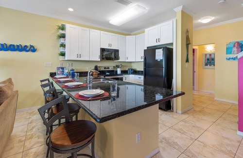 The fully equipped kitchen is perfect for preparing everything from beachside snacks to full family dinners. Dine indoors at the large table or breakfast bar—or fire up the gas grill and eat under the stars.