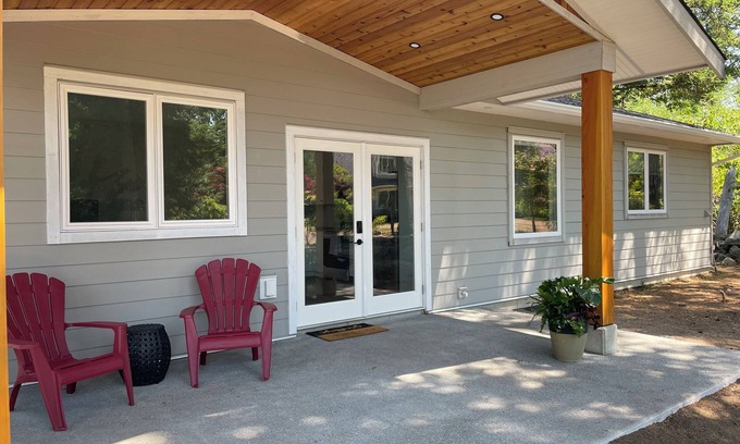 The guest cottage has an open plan kitchen with all of the amenities you will need to cook a great meal. The living room has comfortable seating with large windows, games and a smart tv. Down the hall is the bathroom, with a full tub and shower combo.The bedroom boasts a king size bed and lots of closet space. The laundry is tucked away here as well. Outside on the patio you will find seating and a bbq. Bikes can be locked up around the back side of the house.