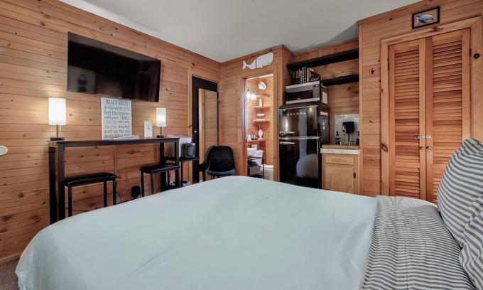 Located at the Seashore Condo Hotel, escape to Unit 10. This charming ground-floor cedar-paneled room is your perfect home base for a relaxing Fire Island getaway. Located by the bay and just moments from the beach, it's ideal for couples or solo travelers looking to unwind by the coast.
