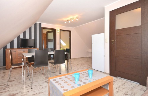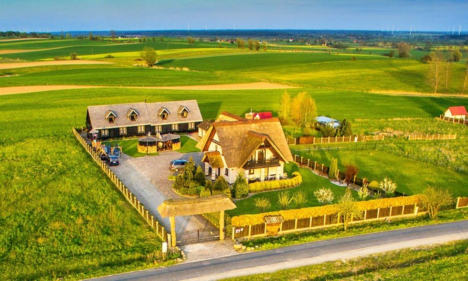 Comfortable family apartment is located in agrotourism area in small coastal village Cisowo, 1 km from sea and lake. The apartment is on the first floor of an air-conditioning complex covered with real thatched roofs. The area of the apartment is 90 square meters. Guests have at their disposal a cozy living room with a dining area and a kitchenette, three bedrooms and a bathroom. Free wireless internet access is available throughout the hotel. In a building a few meters away from the apartment there is a shared kitchen where you can prepare hot meals. There is also a washing machine. There is a car park, a large playground for the children, a barbecue pavilion with places to celebrate on the extensive, managed agritourism area. On site you can enjoy delicious breakfasts and dinners. All meals are prepared on site. Cisowo is situated on a hill from which there is a beautiful view of the sea, the nearby Kopań Lake and the port in Darłówko. About Belvilla When you stay in a Belvilla home, you can rest assured of a unique holiday home in ideal surroundings at an attractive price. The portfolio of accommodations consists of more than 40,000-holiday homes in 20 European countries. Interested in a weekend getaway, a summer or winter sports holiday or simply a short break? Do you prefer the coast, the countryside or the mountains? Whatever your preference, there is a Belvilla home to meet your needs, from a cosy gîte for two to a castle big enough for the entire family, from an apartment in the heart of Rome to a cabin in the middle of nowhere, from a simple tree house to a luxury dream villa and from close to home to the other side of Europe. A Belvilla home gives you the freedom to enjoy breakfast in your pyjamas or continue a good conversation into the morning hours without having to worry about the bar's closing time. Prepare gourmet meals with fresh local ingredients in your own kitchen and take advantage of having your own swimming pool to do as many cannonballs as you want! In other words, you can enjoy complete privacy in your home away from home.