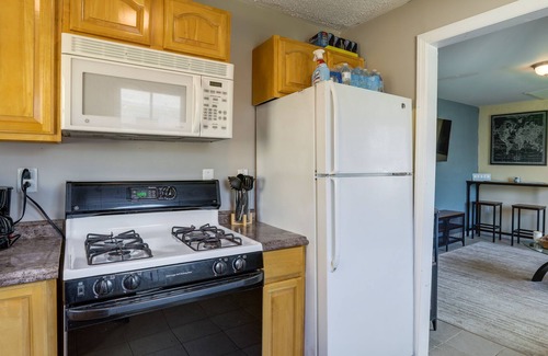 Prepare a home-cooked meal in the kitchen, complete with an oven and a stovetop, as well as a microwave, cookware, and paper towels.