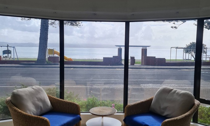 Feel on holiday from the minute you walk in. A semicircle of floor to ceiling windows give you a panoramic view of the sea and land in the curve of Hawke Bay with Spriggs Park playground, rock pools and beach directly in front. Enjoy the seaside village atmosphere as the yacht racing, watersports and cruise ships coming and going happens in your front yard and the waterfront cycleway passes by. All the facilities of a fully equipped house are for your use during your stay in Napier. It is just a couple of minutes stroll to 6 restaurants, several cafes and takeaway options, a cocktail bar and an ice cream parlour available in the Ahuriri Village, along with the Globe Theatrette and specialty shops. Or a 5 minute drive to the waterfront bars and restaurants on the edge of the Marina. Napier CBD is a 5 minute drive away, or catch the bus directly across the road. Our holiday home has a large master suite with a huge walkin wardrobe and an ensuite with both a bath and shower. Across the entranceway is the kitchen/dining/lounge with incredible wide angle windows with tinted semi one way glass so you feel you are as close to the park as you can get! Also a conservatory facing West down the side of the house for sunny lounging in a sheltered space. There is also a bedroom with a king single bed with a trundle bed under it that pulls out and that has legs to raise it to normal height. There is an adjacent toilet and separate shower and handbasin bathroom. Up a short flight of stairs to the other bedroom which has a queen bed and windows looking out the driveway to the sea. There is also an elevated deck wrapped around this room. The laundry and washing line are up on this level above the garage also. A small back courtyard for private outdoor space, but with the seafront directly in front across the road is our preferred outdoor space! Off street parking is available in the driveway. For winter stays, there is a gas fireplace, and the 2 rear bedrooms have oil fin heaters. SkySport is available on the Smart TV and WIFI.