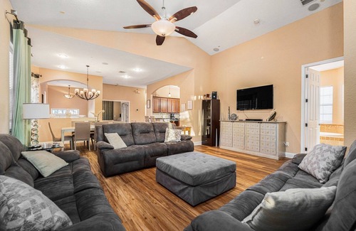 Bring the entire family on vacation to this Luxury Pool home boasting 5 queen beds, two kitchens, two living rooms, and a large gathering area near the salt water pool. Entertain the kids all day with a playing room downstairs, a pool table, heated pool, and yard games.