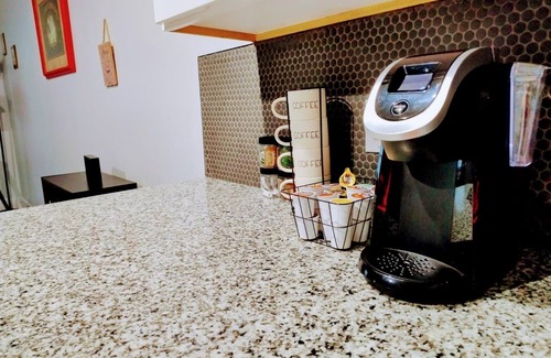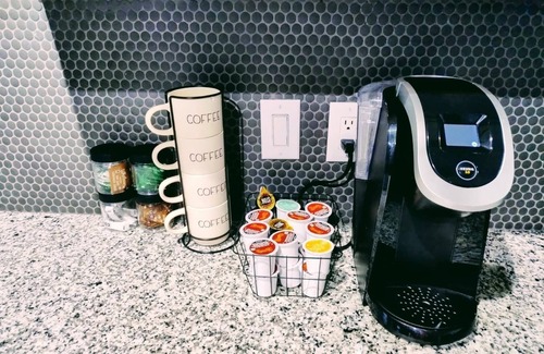 You’ll love preparing meals in this fully stocked kitchen featuring granite countertops, stainless steel appliances, and plenty of cabinet space. From wine glasses to mixing bowls, every essential is here—including cookware, utensils, a blender, and toaster. Brew your morning coffee with the Keurig and enjoy it at the breakfast bar or dining table. Whether you're whipping up dinner or pouring a glass of wine, everything you need is right at your fingertips.
