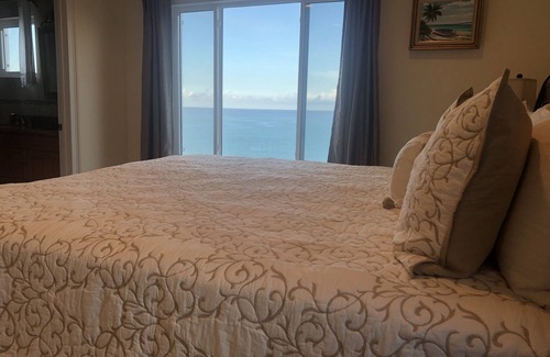 Beautiful luxury hilltop condominium, overlooking the ocean with a spectacular view. You will be captivated by the picturesque ocean view, visible throughout these newly renovated beachfront condominiums.The main floor has an open concept with high ceilings, comfortable seating, flow out to seaside balconies, ideal for relaxation and sunset views with a kitchen with state-of-the-art appliances.