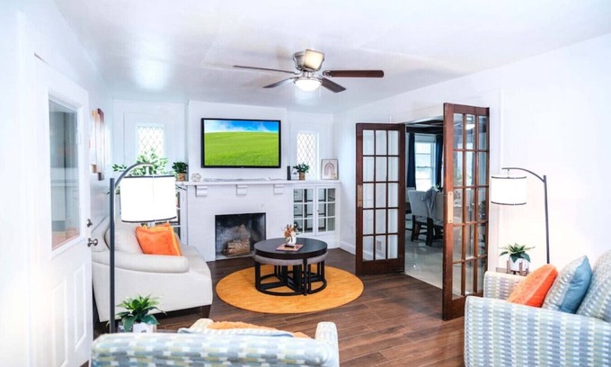 Cozy living room designed with entertainment in mind. A sleek flat-screen TV 58inch is mounted above a beautiful fireplace.
