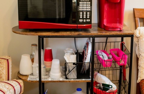 Includes a mini fridge, microwave, and Keurig. Entertainment with Roku, Netflix, Hulu, and Disney+ on two TVs.