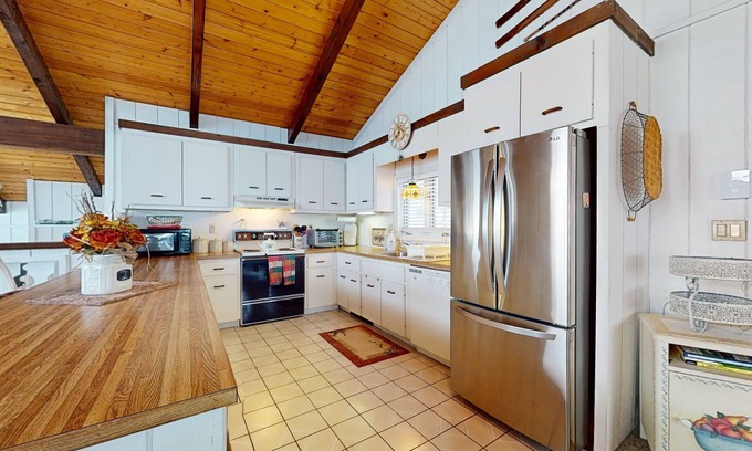 As you enter this quaint home away from home, you can walk up a flight of stairs to reach the main living area, which boasts a beautifully appointed, partially carpeted open floor plan with vaulted ceilings, exposed wood beams, and floor-to-ceiling windows. The living room presents you with a wonderful spot to gather with your loved ones and unwind - the warmth of the wood-burning fireplace invites you to curl up comfortably and stream your favorite shows on the smart TV with streaming services. The living room opens onto a deck with a gas grill should you feel like surprising your guests with grilled treats. Back inside, the home's full kitchen has all the major appliances needed to prepare culinary masterpieces. All three bedrooms can be found on the lower level. Additional perks include free high-speed WiFi.