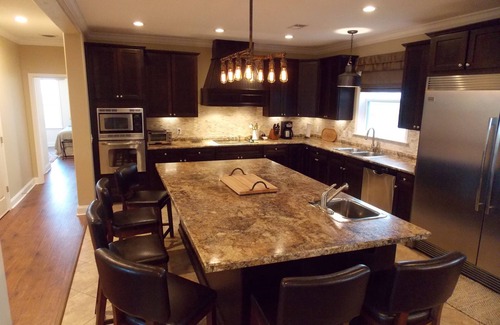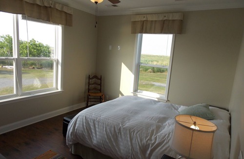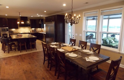 The open living space includes an oversized island and rustic dining table (seats 12), wet bar with sink, extra counter space fully stocked with glasses, cloth linens and an automatic ice machine. The vacation home amenities also include two over-sized furnished decks, indoor/outdoor TV, central heat/air, internet and cable, boat docks, marsh vehicles (additional fee), fishing (additional fee), hunting (additional fee) and sightseeing guides (additional fee), concrete parking for 6 cars and ample cold and hot water for you, your family and friends. Team building? Our rental lodge is perfect for corporate retreats.