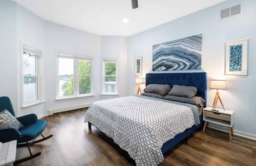 Our lakehouse offers five comfortable bedrooms to accommodate your group's needs. The master bedroom boasts luxury with a Jacuzzi, heated floors, a king-size bed, a TV, and gorgeous lake views ensuring a restful stay. Upstairs, two bedrooms feature TVs and king-sized beds for added comfort and entertainment.