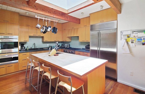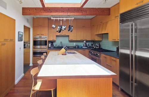 On the opposite side of the living area is a fully-equipped kitchen with island, counter seating and top of the line appliances. The kitchen opens to a large dining room with floor to ceiling glass overlooking the yard.
