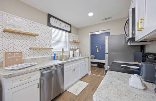 The kitchen is fully stocked with everything you need to prepare meals during your stay, including modern appliances, cookware, and dishware. There's also plenty of counter space and a dining area for enjoying meals together.